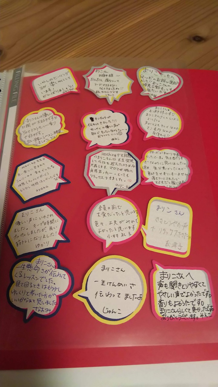 みなさんこんばんは。 実は何度かスマホから投稿しようとして途中で消えるということがあり 凹んで投稿しないまま10日ほどがたってしまいました(^-^; 模擬レッスン初日、なんと当日参加者全員の前で模擬レッスンをすることになり・・・ しかもそれを当日朝知るという(笑) 最後の時間だったこともあり、その前の授業も微妙にそわそわしておりました。 そして15人の前でのレッスン。緊張して余計なことしゃべっておりました。。。 いろいろあってKana先生もManami先生もおらず、ひとみ先生がいらっしゃる中で ひゃー(^-^; となりながらなんとか1時間やりきりました。 内容は・・・これからぼっこでさせていただくレッスンのベースになる内容でした。 終わってからみんなにもらったメッセージ、宝物です...
